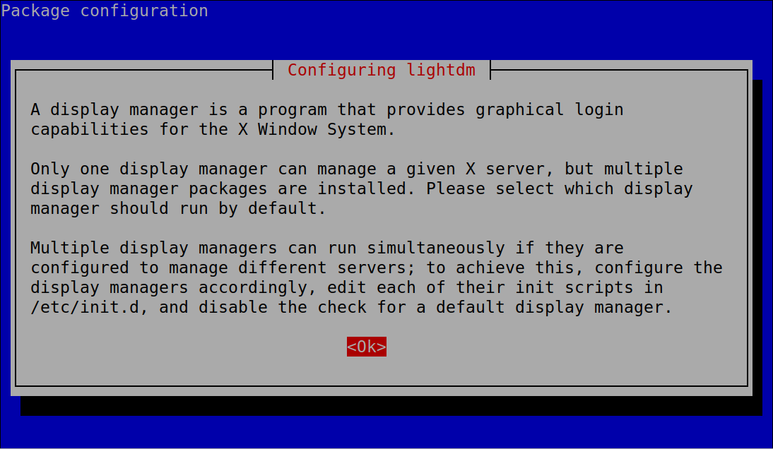 After running the command dpkg-reconfigure, you’ll see the screen shown above with a brief description of display managers. Press OK to continue to the selection menu shown below, where you can choose the display manager you want to change to, select it and press OK.