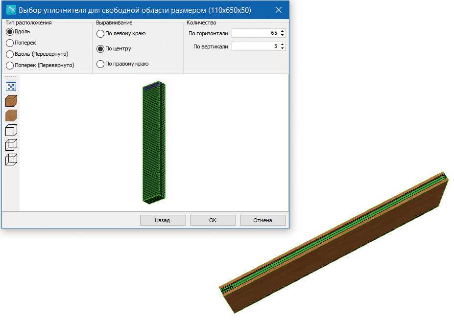 При размещении очередного уплотнителя в свободной области указываются параметры его расположения. Он может быть установлен вдоль области или поперек нее, а также поставлен на ребро. Если размеры области не допускают выбранный вариант установки, то соответствующие опции не будут доступны для использования. Уплотнитель может быть выровнен по выбранной стороне пакета или по центру области.