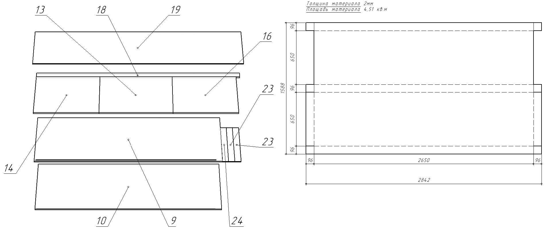- возможность вывода каждой детали со схемой разметки под крепеж и комплексного сборочного чертежа.