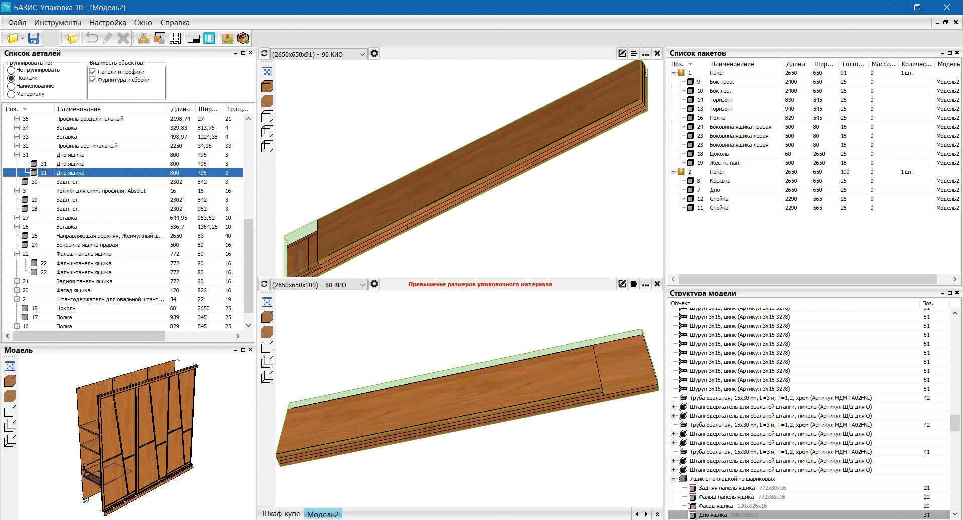 В составе мебельного изделия часто встречаются детали из различных материалов, в том числе хрупких, погонажных (профили) или мелких (крепежная фурнитура). Модуль БАЗИСУпаковка работает с моделями изделий, сформированными в CADмодулях системы БАЗИС, поэтому он автоматически распознает тип детали и материал, из которого она изготовлена, учитывая это при формировании упаковок. В частности, для упаковки фурнитуры и гибких элементов создаются индивидуальные коробки (рис. 2). Это его первая отличительная особенность.