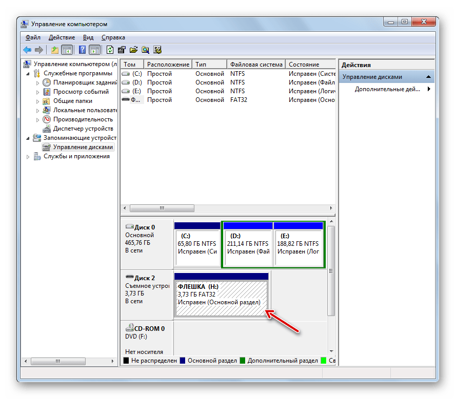 Теперь выясним что делать, если на флешке отсутствует разметка разделов. Сразу нужно отметить, что и в этом случае данные восстановить будет невозможно, а получится только реанимировать само устройство. Исправить ситуацию можно путем применения штатного инструмента системы под названием «Управление дисками». Мы рассмотрим алгоритм действий на примере Windows 7, но в целом он вполне подойдет и для всех других ОС линейки Виндовс.