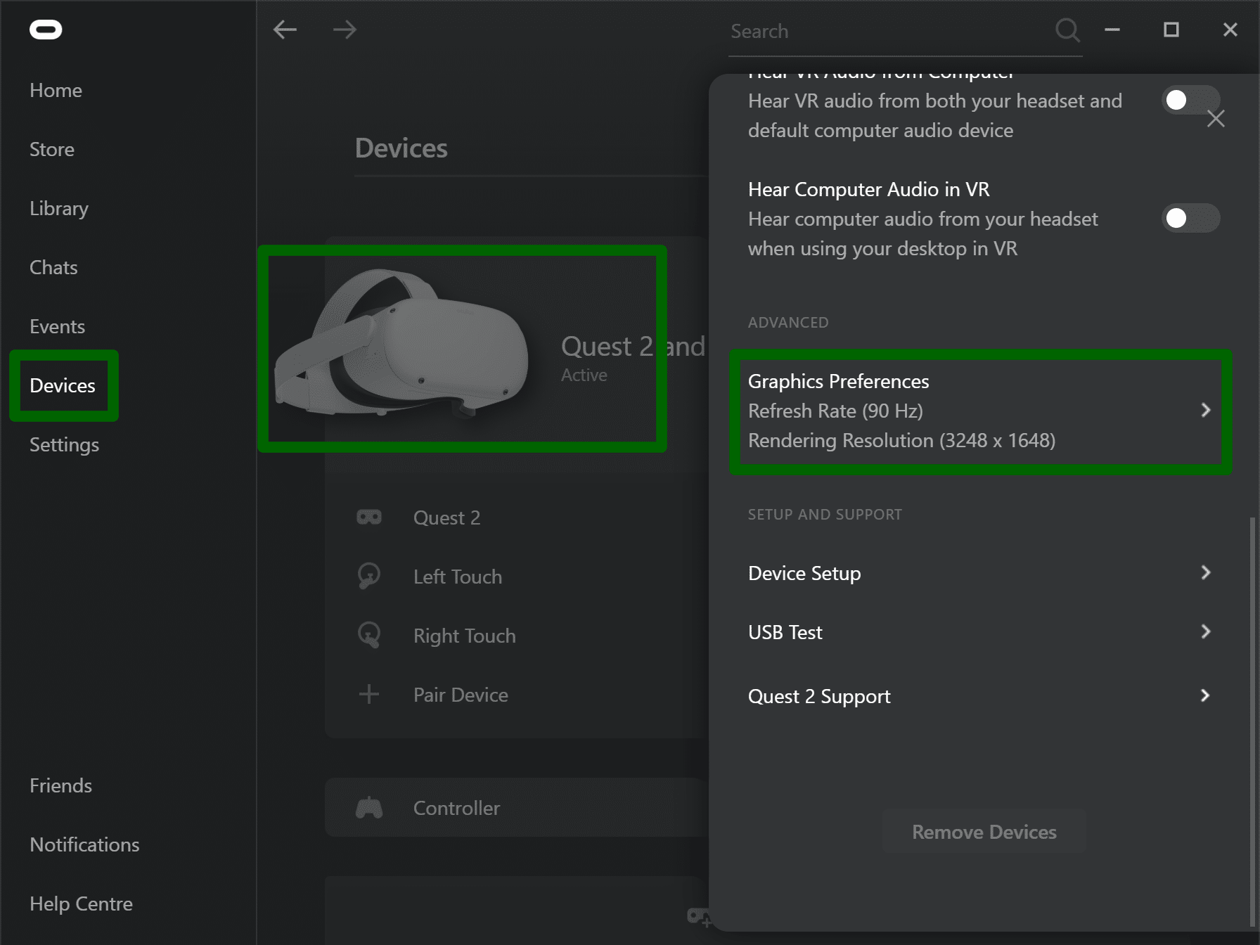 - Select Devices on the left side, then select Meta Quest 2 or Quest Pro from the list of connected devices.