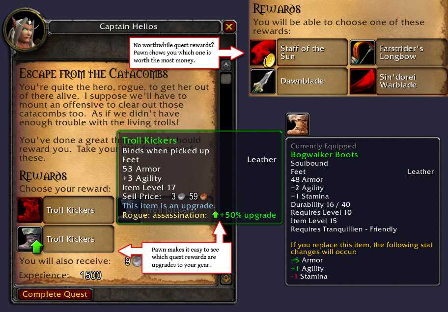К сожалению, в версии 9.0 замена IsContainerItemAnUpgrade может привести к ошибкам taint, что приведет (например) к невозможности поменять оружие с помощью листа символов во время боевой блокировки. Именно так пешка обычно сообщала вашему аддону, должен ли он показывать стрелки обновления. Но начиная с Pawn 2.4.2, Pawn поставляет PawnIsContainerItemAnUpgrade вместо замены встроенной версии. Чтобы заставить предложения пешки снова работать с вашим аддоном сумки, просто используйте PawnIsContainerItemAnUpgrade всякий раз, когда он не равен нулю, и IsContainerItemAnUpgrade в противном случае.