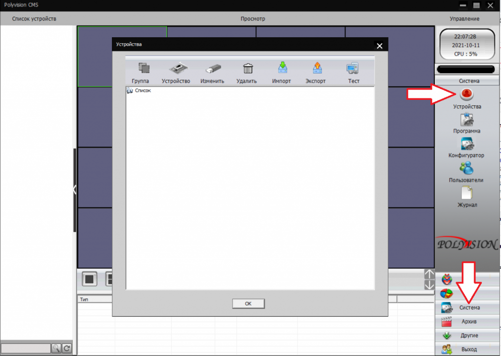 - Добавление нового устройства (регистратора или IP камеры) необходимо зайти в настройки СИСТЕМА — УСТРОЙСТВА. Нажать на красную кнопку, тем самым откроем дополнительное меню.
