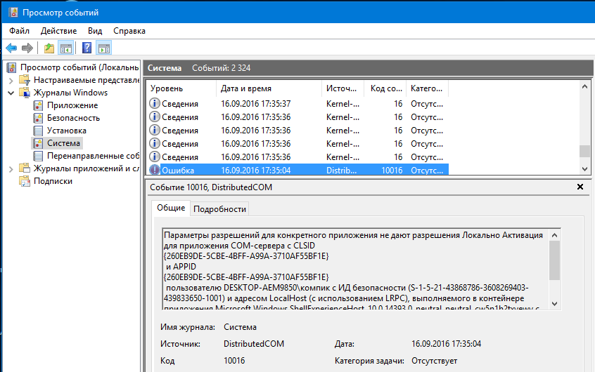 Ошибка DistributedCOM 10016 в Windows 10 — это системное событие, поэтому находится она в пункте «Система» раздела «Журналы Windows» в меню слева. Справа расположен список событий, в котором и можно найти ошибку — она помечена красной иконкой с восклицательным знаком. В верхнем окне справа отмечается основная информация о событии — точное время, код и источник. В нижнем окне служба показывает всю информацию об ошибке, которой достаточно для ее решения, но разобраться в этих данных может быть сложно для начинающего пользователя.