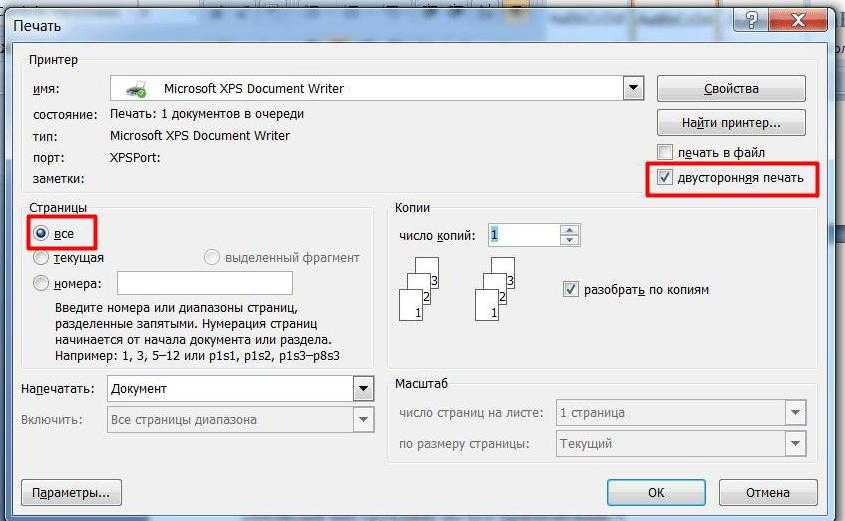 - Обязательно установите галочку напротив строки «двусторонняя печать». Зачастую она располагается на правой стороне сверху.
