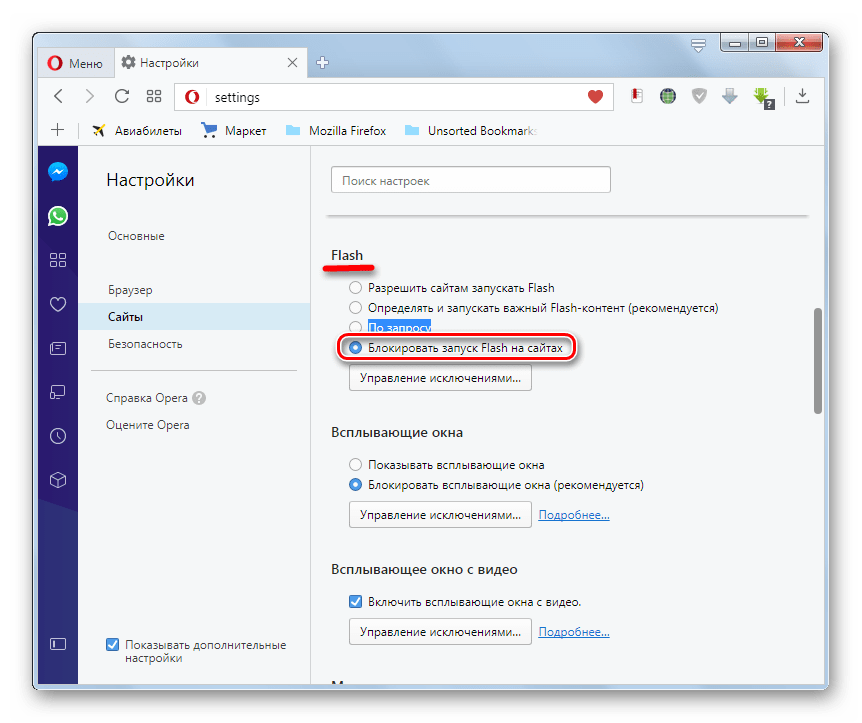 Для включения функции плагина «Flash Player» в открывшемся разделе найдите блок «Flash». Если в нем радиокнопка активирована в позиции «Блокировать запуск Flash на сайтах», то это означает, что функция указанного плагина отключена.