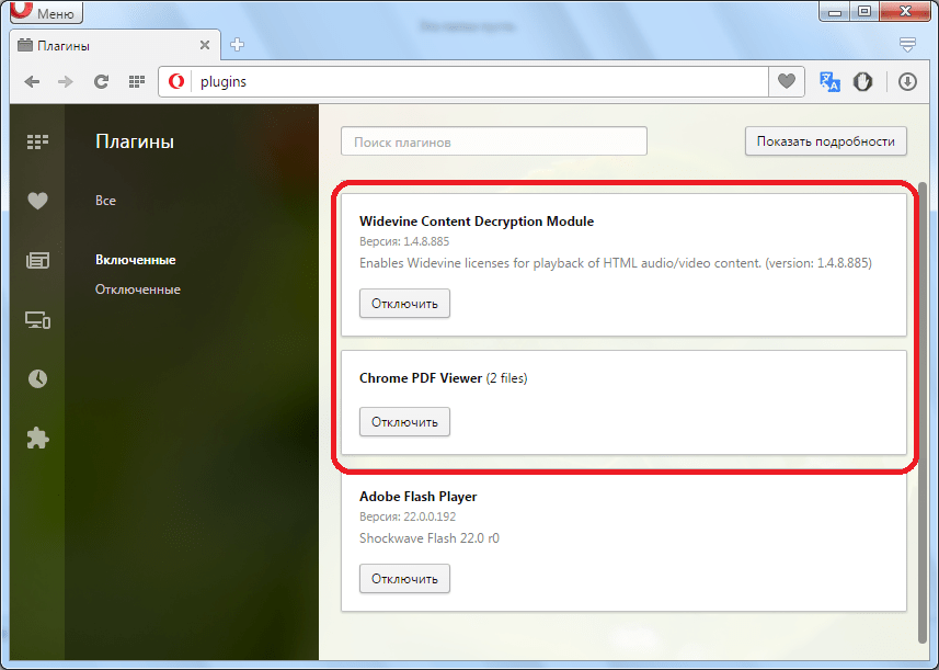 В нашем случае браузер указывает на пункт «Настройки контента», «Flash». Вы можете быстро перейти к этому разделу, введя в адресной строке браузера Opera следующую команду «opera://plugins. Включение и установка плагина Flash находятся именно в этом окне.