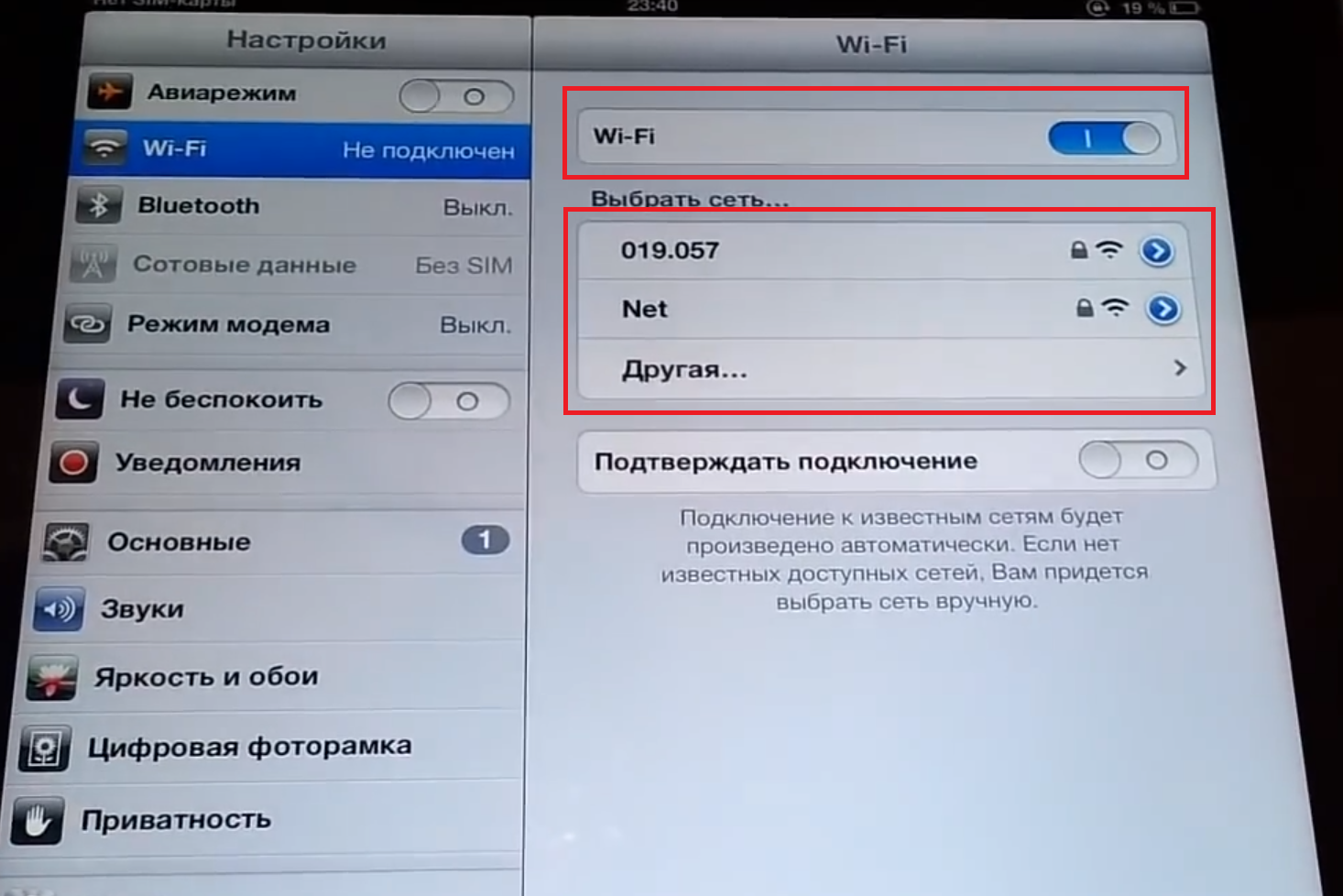 Также стоит попытаться настроить wifi. В разделе «Настройки» выбирается «wifi» и пользователь убеждается, что он включен.