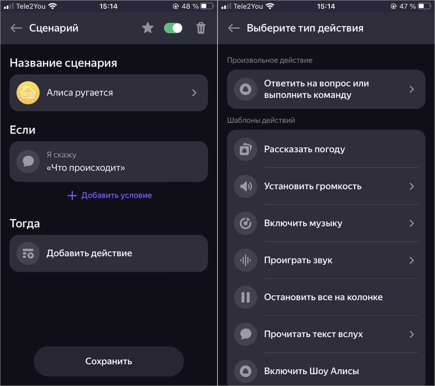 Одной из интересных возможностей Яндекс станции является настройка Алисы на матерщину. Для этого можно создать сценарий в приложении «Умный дом с Алисой». Например, создаем новый сценарий с названием «Алиса матерится» и выбираем тип действия «Прочитать текст вслух», который будет активироваться по фразе «Ругайся».