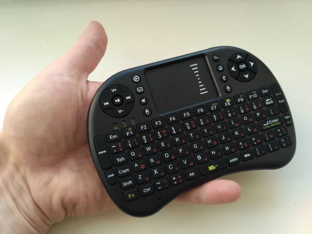 Разумеется, речь идёт о беспроводном варианте, в продаже встречаются и мини-клавиатуры, занимающие относительно немного места и легко умещающиеся на коленях. Стоимость таких девайсов пониже, чем у AirMouse, но ненамного. У них имеется даже тачпад, как у ноутбуков, но работать с ним в режиме настройки/управления менее удобно, чем клавишами управления курсора.
