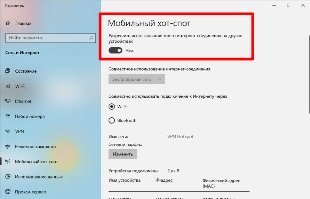Переведите в активное положение переключатель «Разрешить использование моего интернет-соединения на других устройствах».
