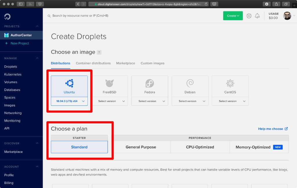 - Choose a plan — выбор плана обслуживания, для нас достаточно Standart и объема данных на $5 в месяц (0,007 в час — за эти деньги получаем 1 ТБ трафика в месяц);