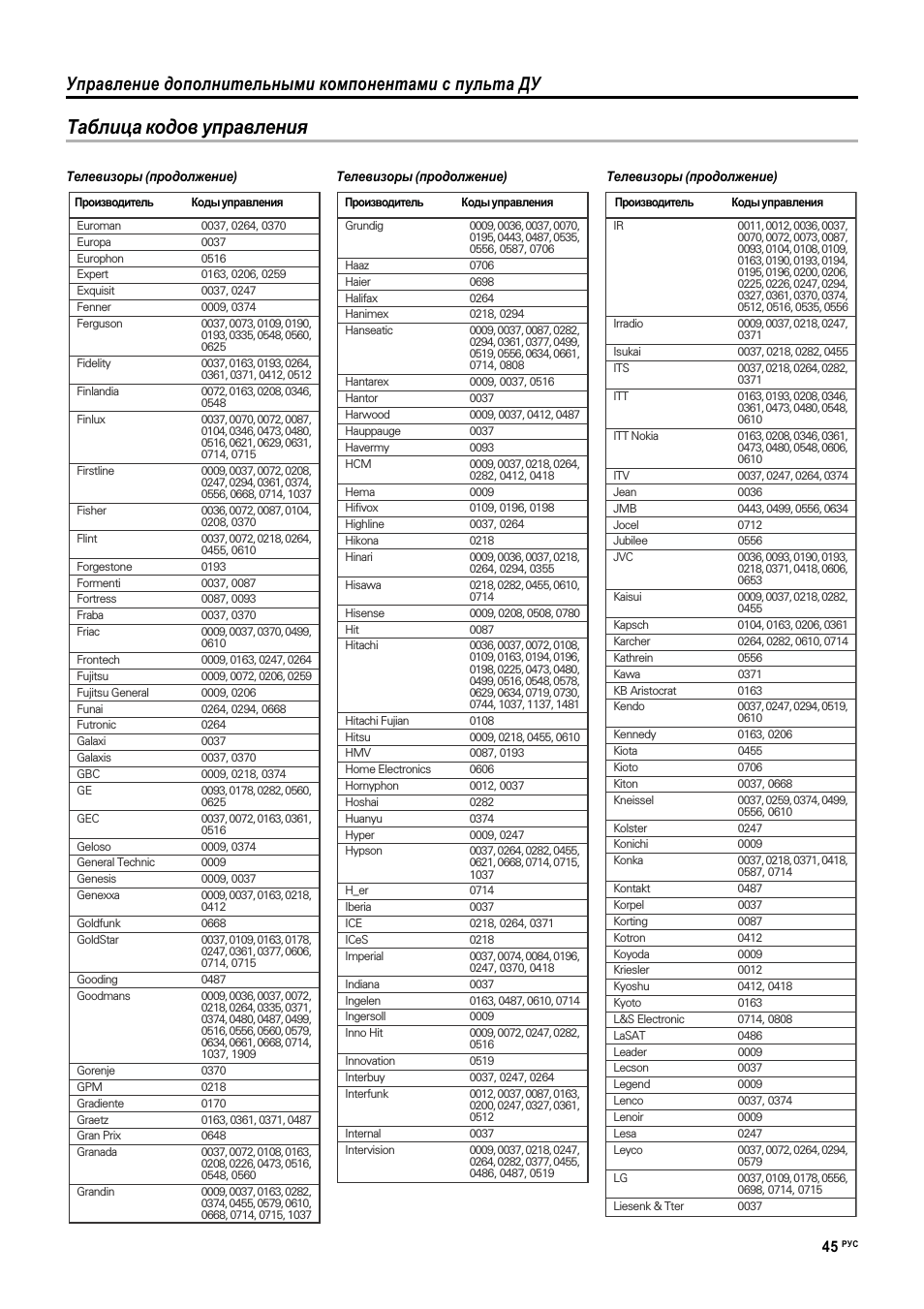 Обратите внимание, что указанный список кодов является неполным. Возможно, вам потребуется использовать другой источник кодов для вашего конкретного устройства