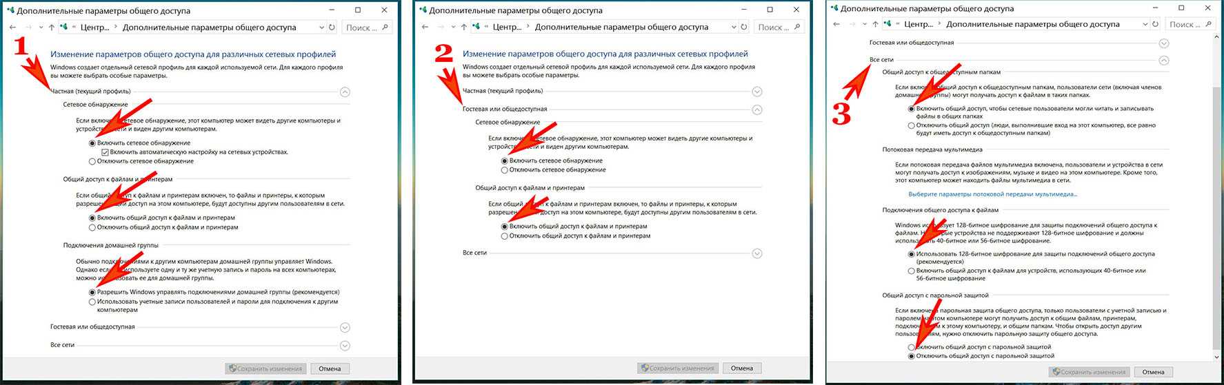 - Проделать это нужно во всех профилях, кроме того включить пункт “общий доступ, чтобы сетевые пользователи могли читать и записывать файлы в общих папках”.