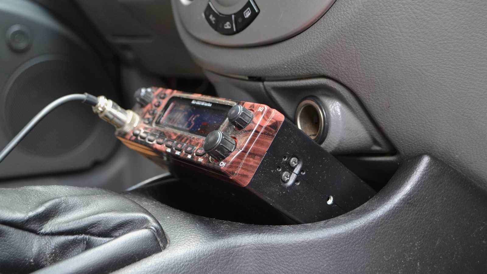 Следующее руководство по установке CB-рации в автомобиле предназначено не для тех, кто применяет аппарат ежедневно и профессионально, а для тех, кому оно нужно для периодического использования, в основном в дальних поездках. В этом случае большинство водителей предпочтут не устанавливать рацию в салоне на постоянной основе, портя интерьер и провоцируя парковочных воров, а захотят временно разместить ее в подходящем месте: между сиденьями, между сиденьем и боковой стойкой, либо в лотке для мелочей под торпедо, как это сделано, например, на фото: