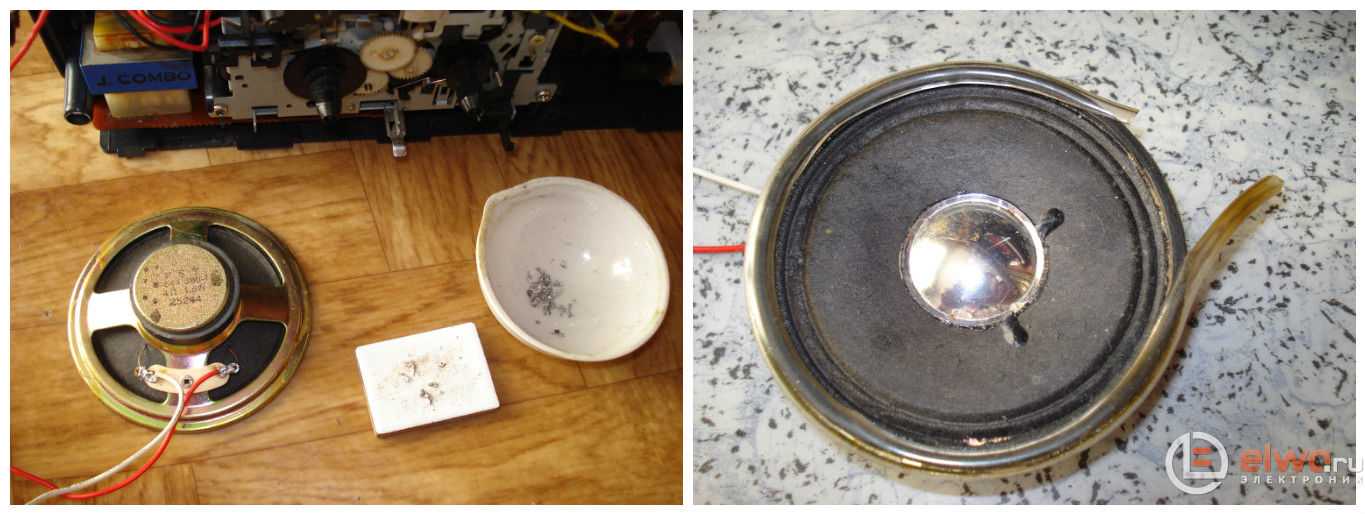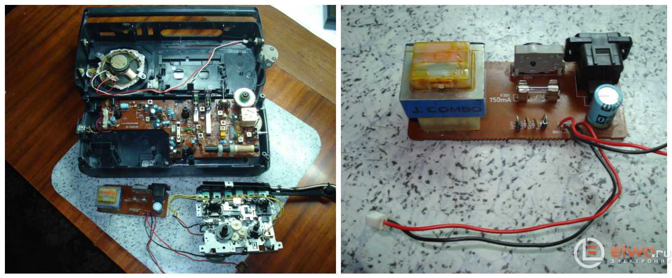 Вскрыл корпус, стал разбирать на составные части. Ни к блоку питания, оказавшемуся супер примитивным, что внизу слева, ни к лентопротяжному механизму магнитофона, справа от него, претензий нет. Один выдаёт «на гора» свои 12 В, а второй исправно тянет магнитную ленту.