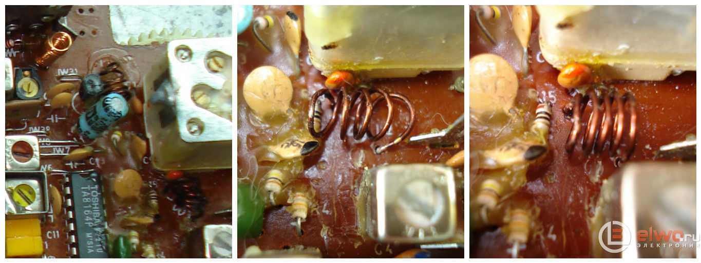 И тут, очень кстати вспомнил, что мастер дорабатывавший магнитолу говорил про какие-то проволочные спирали. На плате их оказалось несколько и все в районе конденсатора переменной ёмкости. Частично собрал аппарат, включил и на нужном диапазоне стал касаться навитых кольцами медных проводов отвёрткой. Два не отозвались, а едва дотронулся до третьего, в динамике появились характерные изменения звука. Нашёл! На фото нижний. Потрогал хорошо его пинцетом, а он болтается. Выпаял, расправил и по новой навил, на оправке подходящего диаметра. Запаял на место. FM диапазон ожил. Тут вконец осмелел и давай шевелить отвёрточкой витки (увеличивать и уменьшать зазор между ними). В ответ на мои действия стало изменяться расположение и количество станций на шкале. Но самым удобным для настройки оказались два пинцета. Растягивал и сжимал их как гармошку, только нежно. Наглядно это действо смотрите на видео.