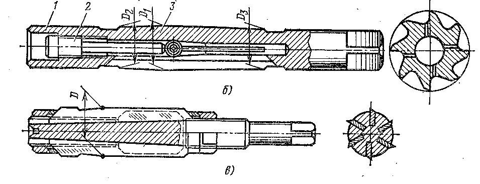 Ручная раздвижная развертка (Рис. в). В корпусе выфрезерованы конусные пазы, в которые вставлены ножы. Перемещение ножей в осевом направлении приводит к изменению диаметра развертки. Предел регулирования 0,5…4,5 мм.