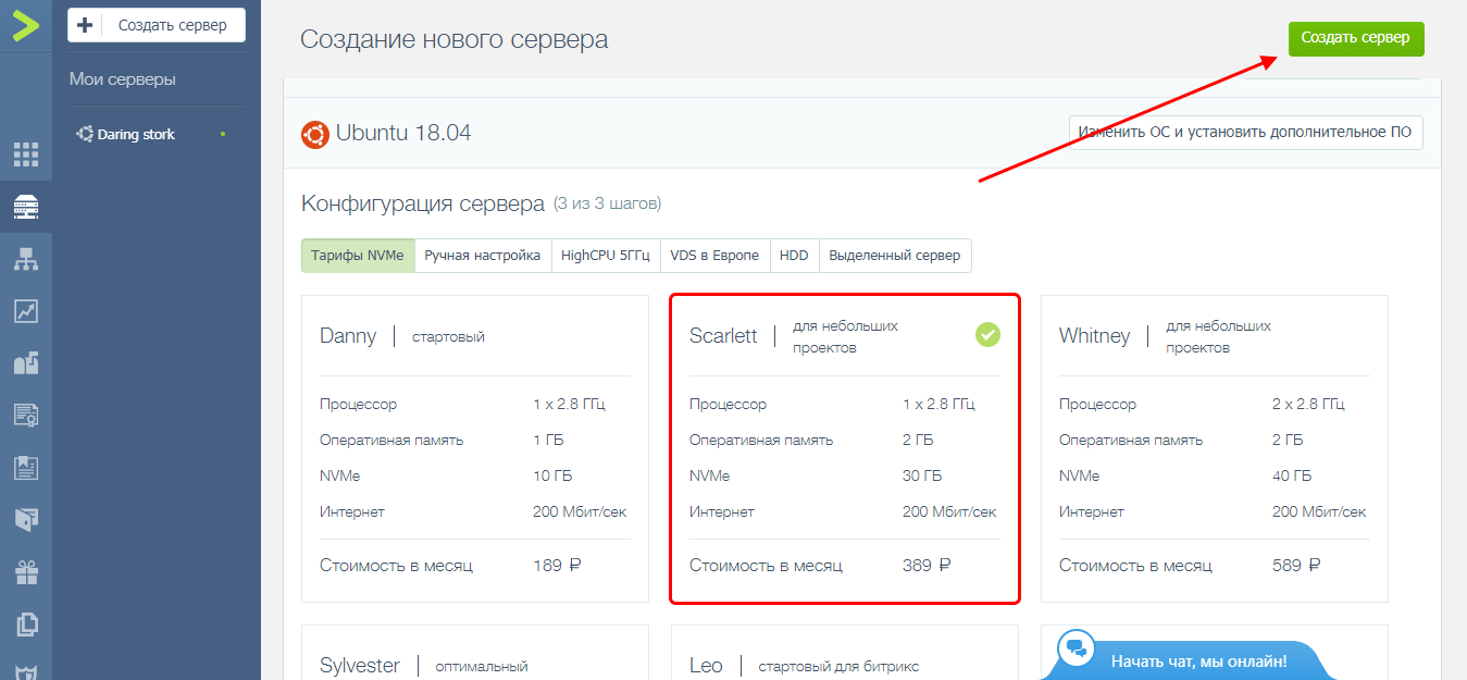 Осталось выбрать тарифный пакет – здесь все зависит от ваших потребностей. Если проект на начальной стадии, то хватит тарифа Scarlett, для мощных проектов рекомендую воспользоваться Sylvester или присмотреться к категории «HighCPU 5ГГц». Для примера подключим Scarlett и завершим настройки.