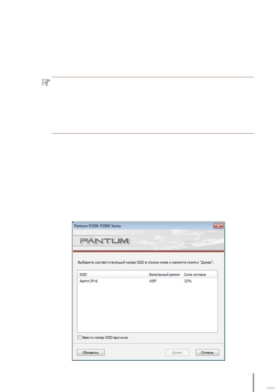 - В разделе настройки Wi-Fi найдите список доступных сетей. Ищите название сети, которое начинается с префикса «PANTUM_» (например, «PANTUM_XXXXXX»). Это название создает сам принтер.