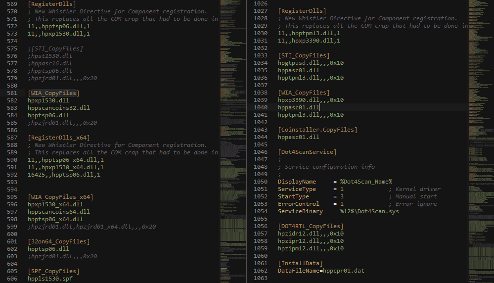 Список файлов драйвера можно посмотреть в разделах inf-файла с именами , , и далее по файлу. Скриншот по драйверам 3055 и 1536, для наглядности: