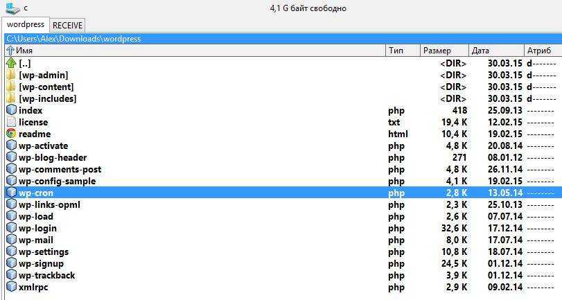 У меня скачался файл wordpress-4.1.1-ru_RU.zip. Распаковываем его. Внутри каталог wordpress, а в этом каталоге файлы: