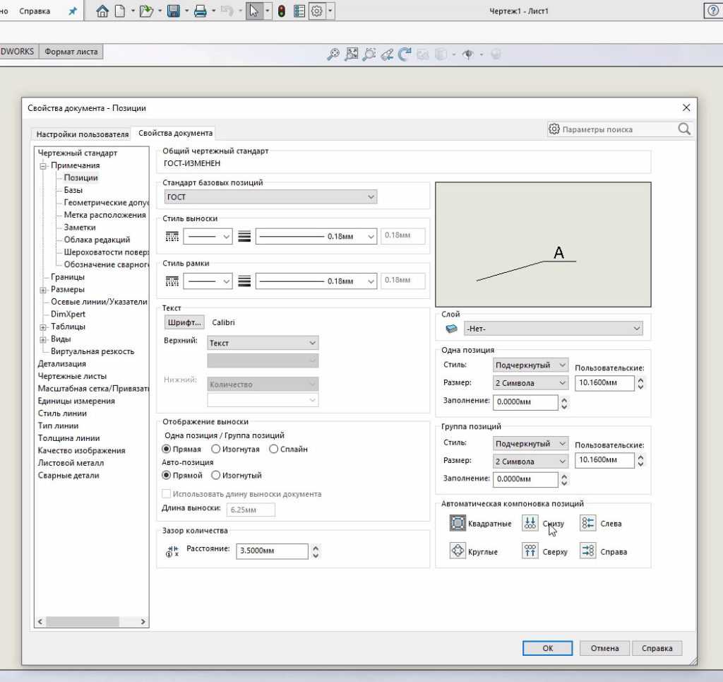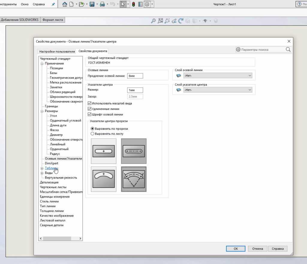 Настройка раздела Осевые линии/Указатели в чертеже св SolidWorks