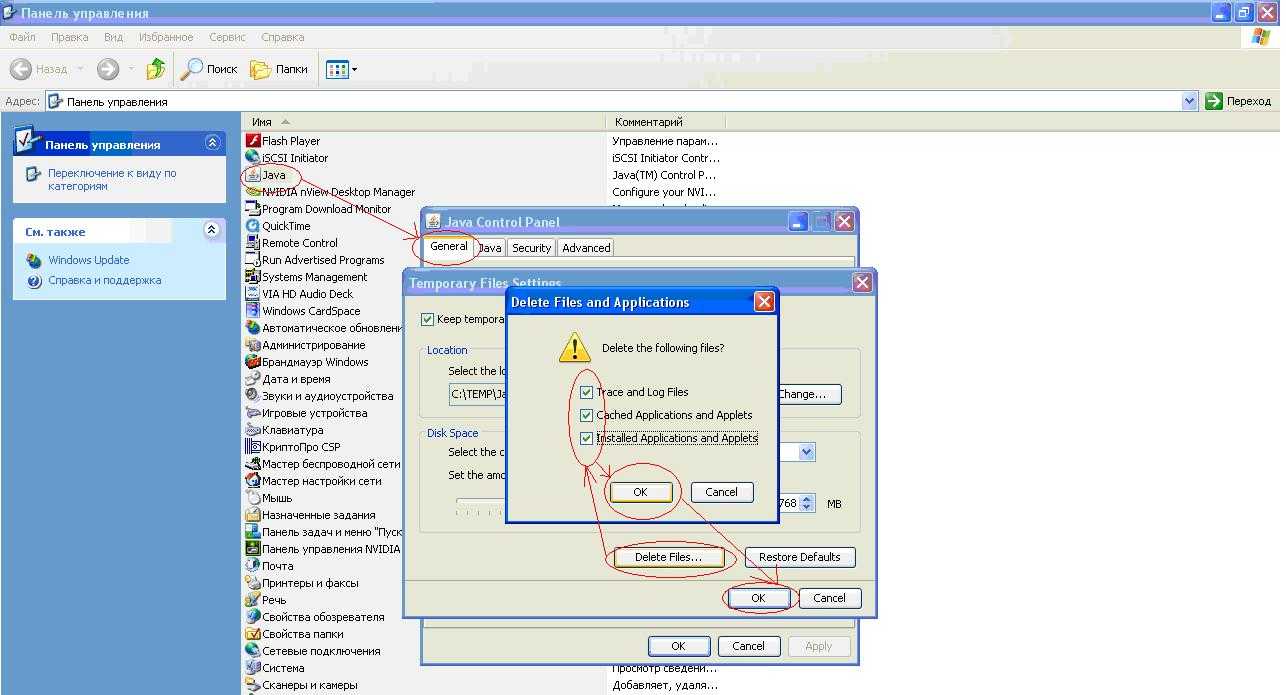 — очищаем кэш явы. Для этого в том же окне «Temporary Files Settings» нажимаем кнопку «Delete Files…» и в открывшемся окне «Delete Files and Applications» ставим три галочки и нажимаем «OK», затем в окне «Temporary Files Settings» нажимаем «OK»