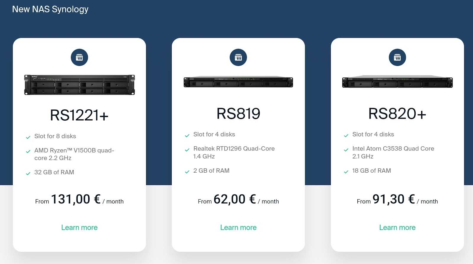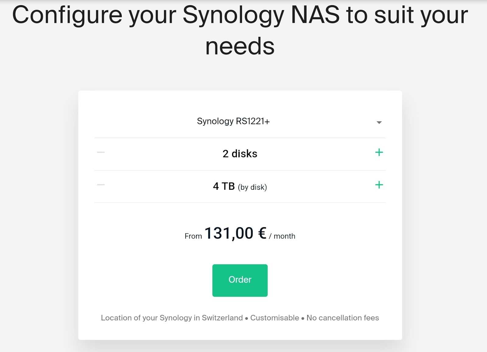 Служба Infomaniak позволяет Вам настроить NAS Synology, выбрав тип NAS Synology, количество дисков и общее пространство для хранения на каждом диске.