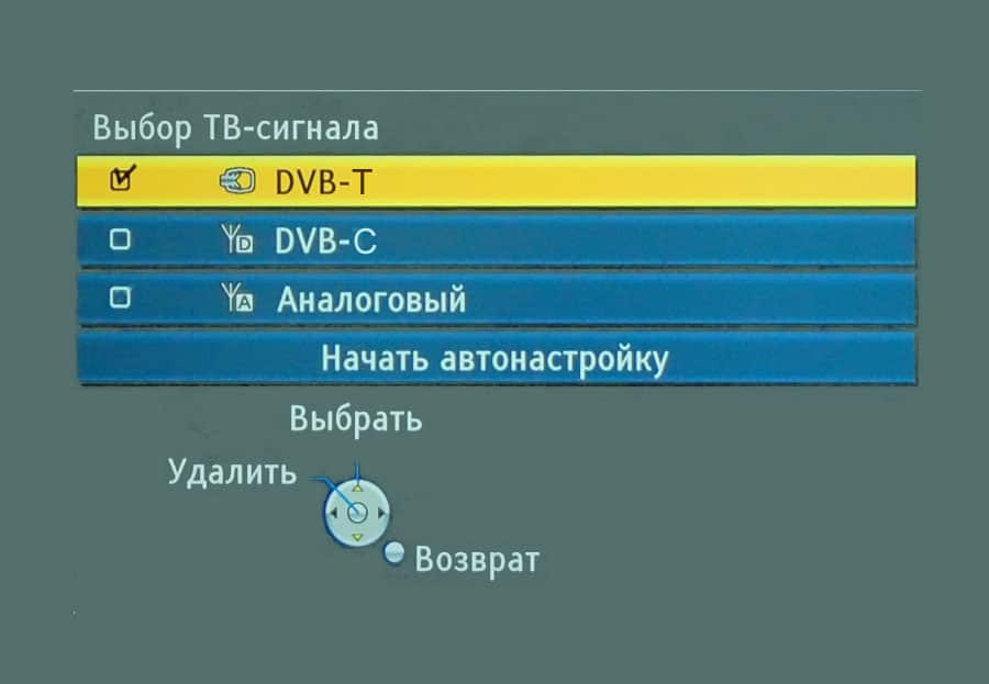 Перемещение по пунктам выполняется с помощью стрелок вверх и вниз, а выбор клавишей ОК. После того, как вы отметили нужные пункты, опускайтесь в самый низ и жмите «Начать автонастройку». Запустится сканирование каналов.