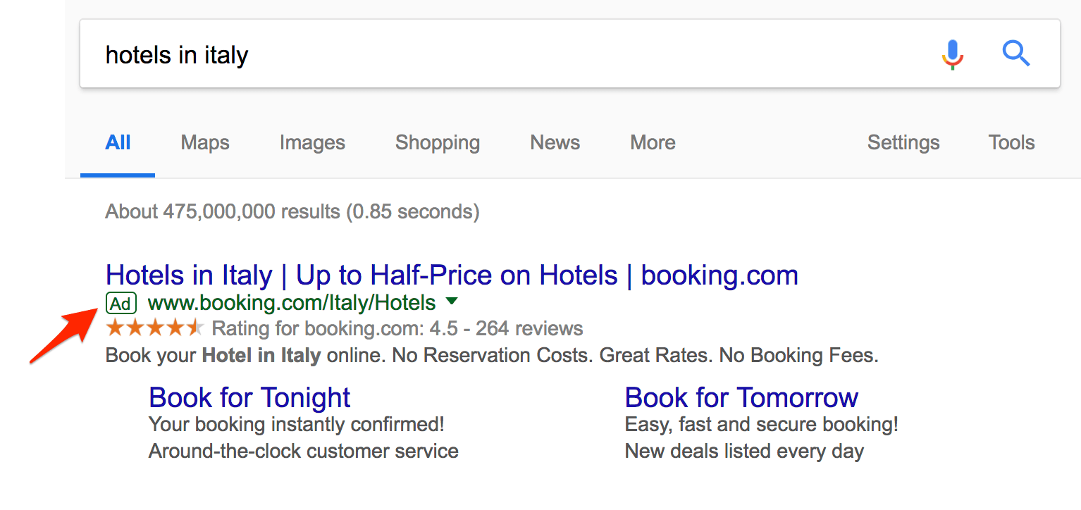 Объявления Google включают небольшой значок “реклама”, чтобы идентифицировать их как платные, как в примере ниже:
