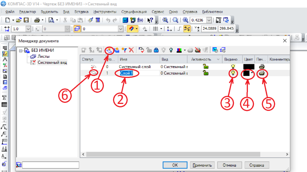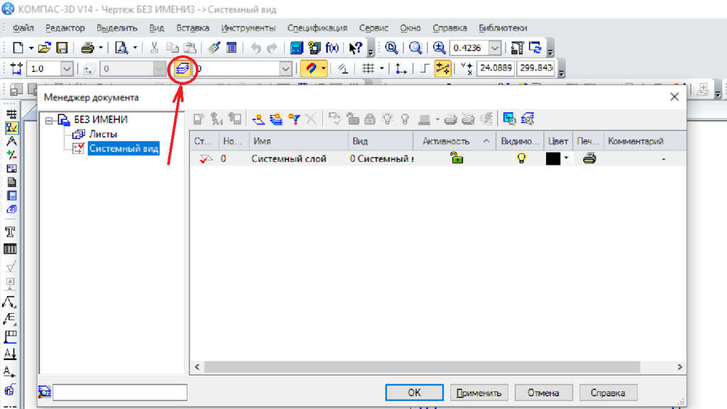 Создаем новый слой, для этого переходим в управление слоями. Кнопка управления находится на третьем уровне верхней панели, как показано на картинке ниже. В открывшемся окне появится список уже созданных слоев, который на данный момент состоит только из системного слоя, имеющего номер 0, черный цвет, активность, видимость и разрешение к печати. Этот слой удалить невозможно, так как он создается по умолчанию.