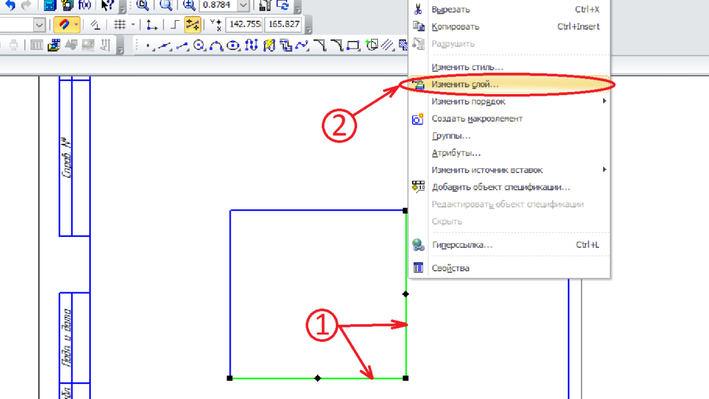 Слой создан. Переносим объекты. Компас не позволяет добавить объект в новый слой за одно действие, придется сначала вручную выделить каждую линию объекта, чтобы выделить несколько линий разом, необходимо зажать клавишу Ctrl и выделить левой кнопкой мыши необходимые линии (отрезки). Наводим указатель мышки на один из выделенных отрезков, щелкаем правой кнопкой мышки и выбираем «Изменить слой».