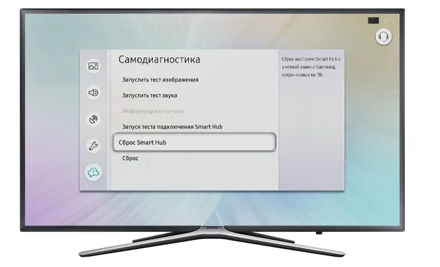 В случае некорректной работы ПО телевизора, частых сбоев и зависаний выполните сброс Смарт Хаб «Самсунг». Для этого найдите в настройках раздел «Поддержка», а в нём пункт «Самодиагностика». Здесь нажмите «Сброс Smart Hub».