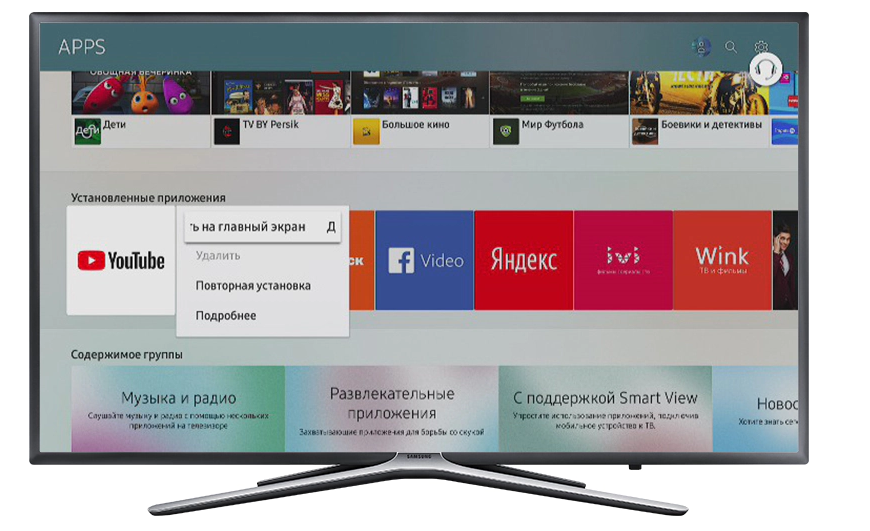 Откройте раздел Apps, где находятся приложения, на главном экране Smart Hub и найдите проблемную программу. Нажмите клавишу Tools или удерживайте центральную кнопку пульта. Появится меню, в котором нужно кликнуть пункт «Повторная установка».