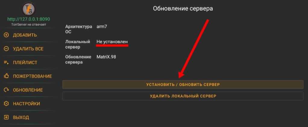 В меню настроек «Обновление» Torrserve есть пункт «Установить APK». Если на него нажать — установится новая версия программы Torrserve. В принципе они одинаковые и работают по одному и тому-же принципу. Настройка Torrserve Matrix выглядит несколько по другому, и меньше пунктов нужно изменять. После установки Torrserve версии Matrix — откройте приложение. Находим пункт » Обновление» и нажимаем кнопку «Установить/обновить сервер». После установки сервера заходим в меню «Настройки» — выбрать плеер. Устанавливаем Wimu или Kodi.
