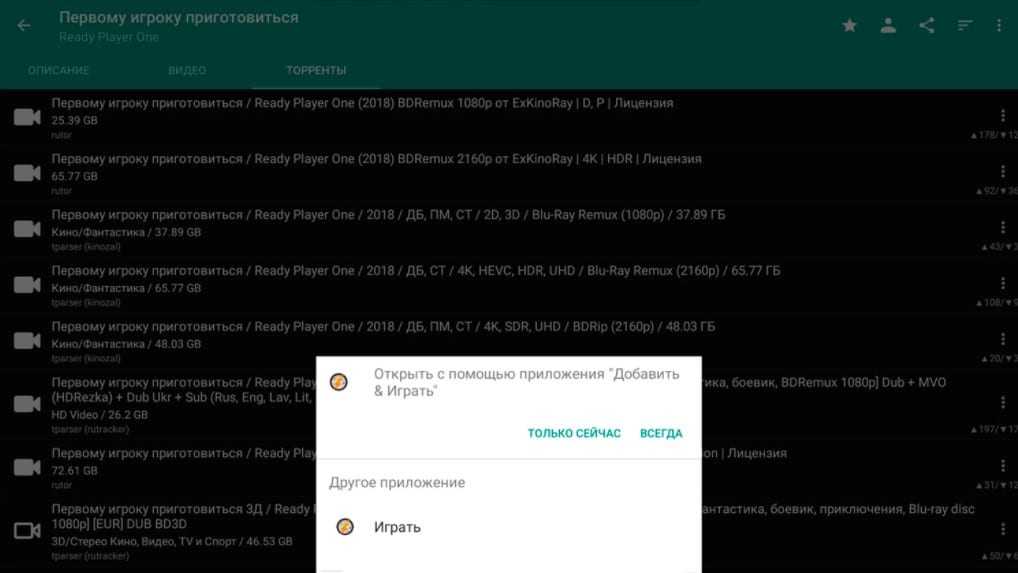 “Добавить” – торрент добавится в список приложения, без воспроизведения видео. Эта опция удобна, если вы при поиске фильма заинтересовались другими видео и желаете потом их посмотреть, не возвращаясь в интерфейс кинотеатра и не теряя время на повторный поиск.