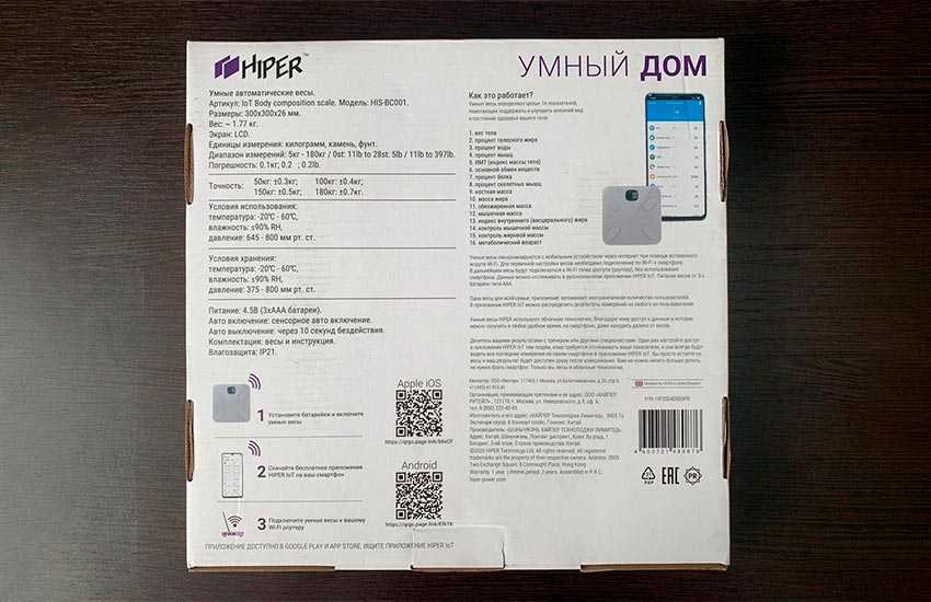 Размеры устройства составляют 30х30х3 см. Благодаря этому весы HIPER занимают совсем немного жилого пространства – как в процессе эксплуатации, так и при хранении. Вес изделия – 1770 г. Максимальный вес пользователя – 180 кг. Допустимая погрешность при взвешивании – 100 г. Питание умных весов HIPER IoT Body Composition Scale осуществляется за счет применения трех батарееек AAA.