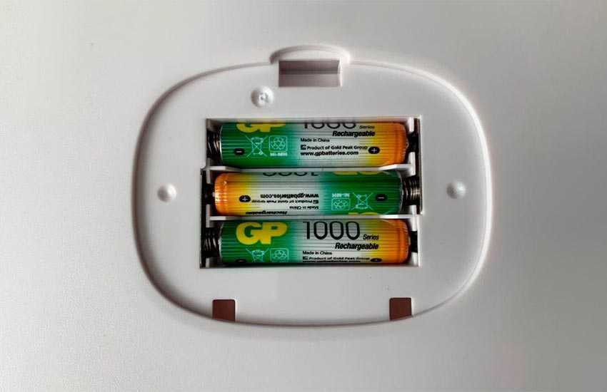 - Установка батареек. Снимите крышку на нижней стороне весов, вставьте в батарейный отсек 3 купленные батарейки AAA. Закройте крышку и переверните весы, приведя их в рабочее положение. При правильном выполнении действий на дисплее появятся нули.