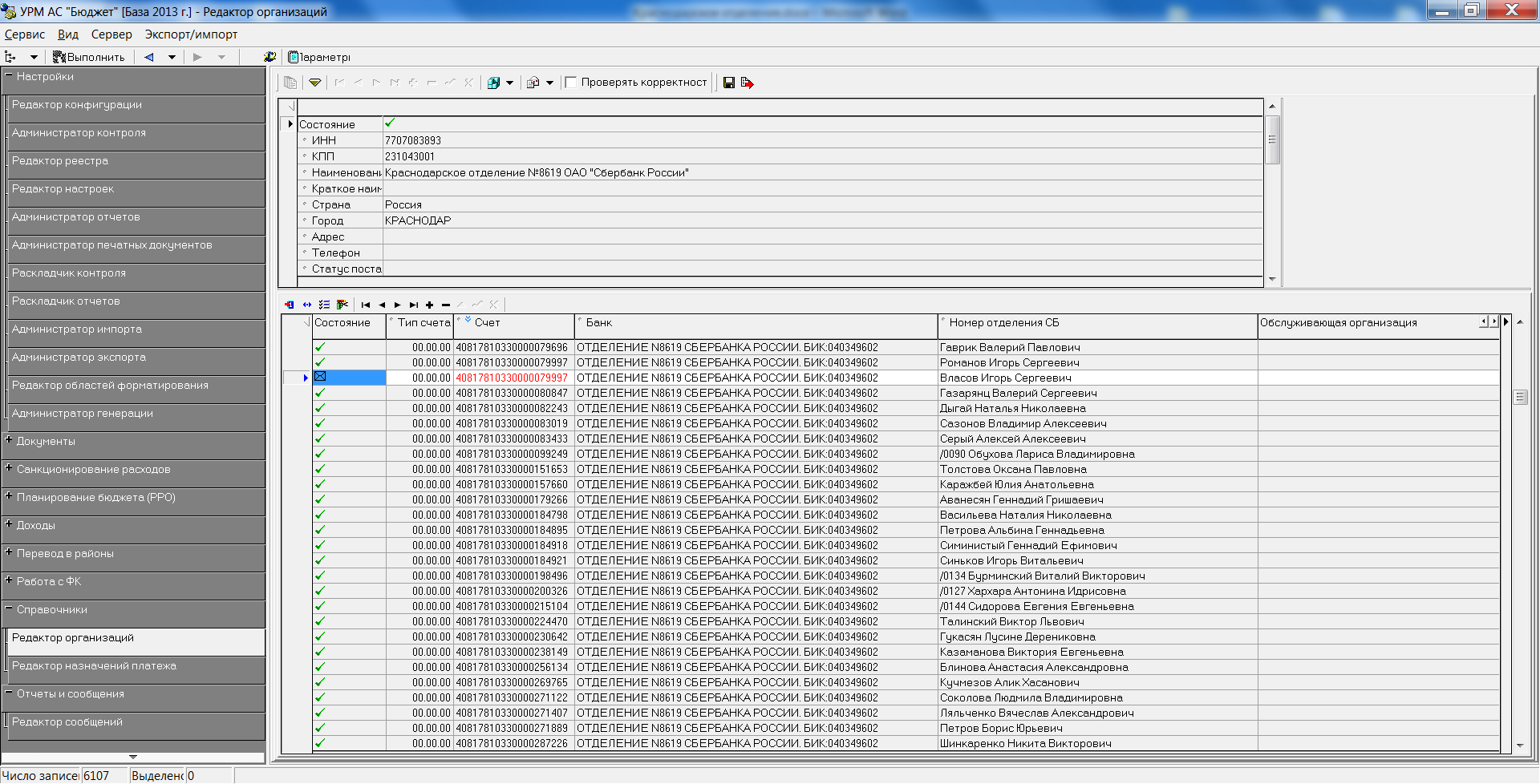 2.8 Пример добавления в справочник организаций физического лица, не имеющего собственный ИНН:В справочнике организаций необходимо по ИНН и КПП найти банк, в котором открыт расчетный счет физического лица, и в детализации организации (банка) заполнить поля «Банк» и «Счет». При этом, в детализации необходимо заполнить поле «Номер отделения СБ», указав наименование филиала банка или дополнительного офиса (если необходимо) и Ф.И.О физического лица, как показано на рис 10.Рис 10. Вид страницы «Редактор организаций» «Детализация»