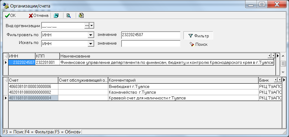2.4 Пример заполнения организации, не имеющей лицевого счета, но обслуживающийся в Управлении Федерального казначейства Краснодарского края (УФК):Заголовок заполняется так же, как и в «простых» организациях, за исключением того, что в детализации поле «Тип счета» необходимо заполнить значением «01.01.02», в поле «Счет» поставить пробел (поле «Банк» не заполнять) и заполнить реквизиты обслуживающей организации, как показано на рис 6.Рис 6. Вид страницы «Редактор организаций» «Обслуживающая организация»