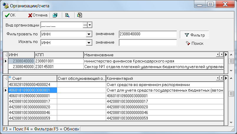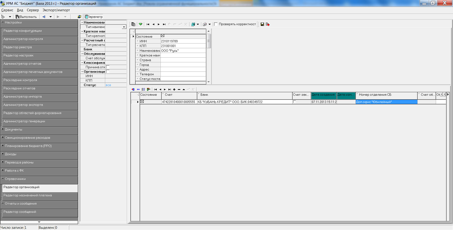 2.3 Пример заполнения организации, имеющей лицевой счет в Управлении Федерального казначейства Краснодарского края (УФК):Заголовок заполняется так же, как и в «простых» организациях, за исключением того, что в детализации в поле «счет» необходимо ввести значение лицевого счета, открытого в УФК, «Тип счета», выбрав значение «01.01.01» (поле «Банк» не заполнять) и заполнить реквизиты обслуживающей организации в полей «Обслуживающая организация», как показано на рис 5Рис 5. Вид страницы «Редактор организаций» «Обслуживающая организация»