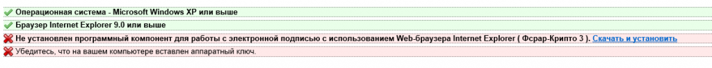 Эта проблема связана с тем, что на вашем компьютере не установлено программное обеспечение «Фсрар-Крипто 3». Следуйте инструкциям на экране, и «Фсрар-Крипто 3» будет установлен на ваш компьютер, после чего нужно закрыть Internet Explorer и зайти на сайт заново.