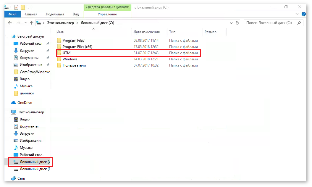 Проводник Windows 7, расположение папки УТМ на локальном диске