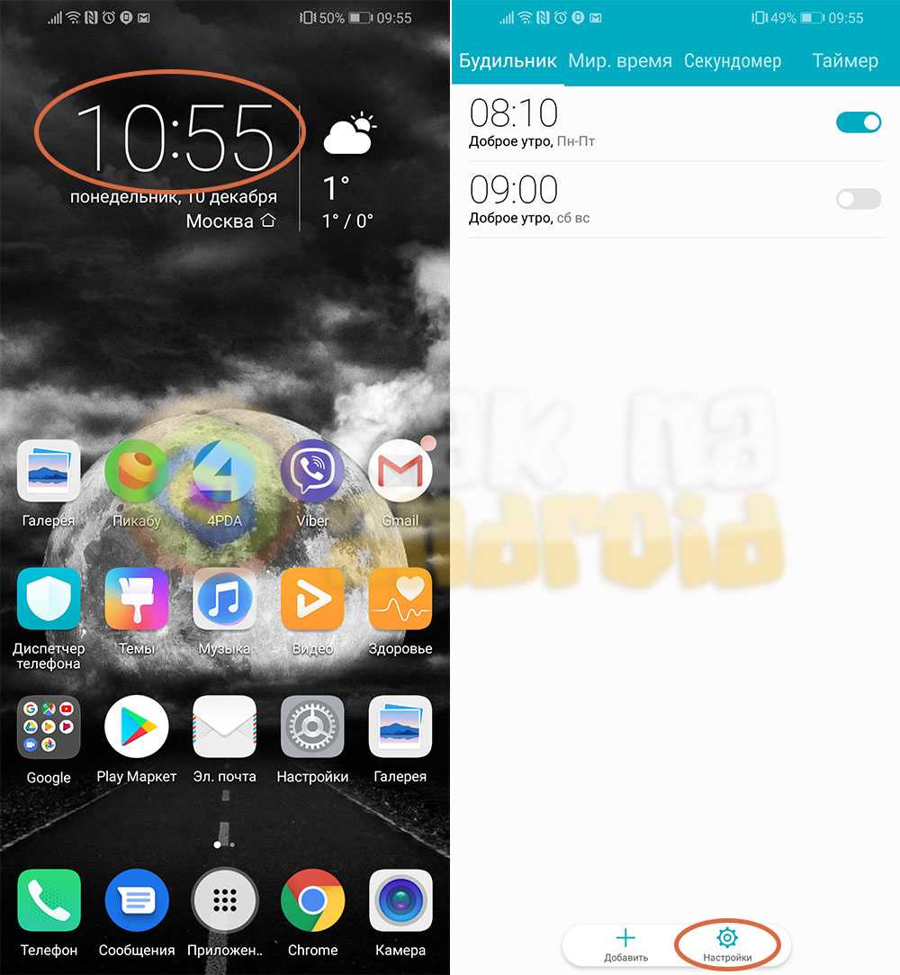 Кроме того, в зависимости от версии Андроид на Huawei Honor 20 Pro может быть предустановлено приложение «Часы». Как и настройки устройства, оно прекрасно подходит для изменения параметров даты и времени: