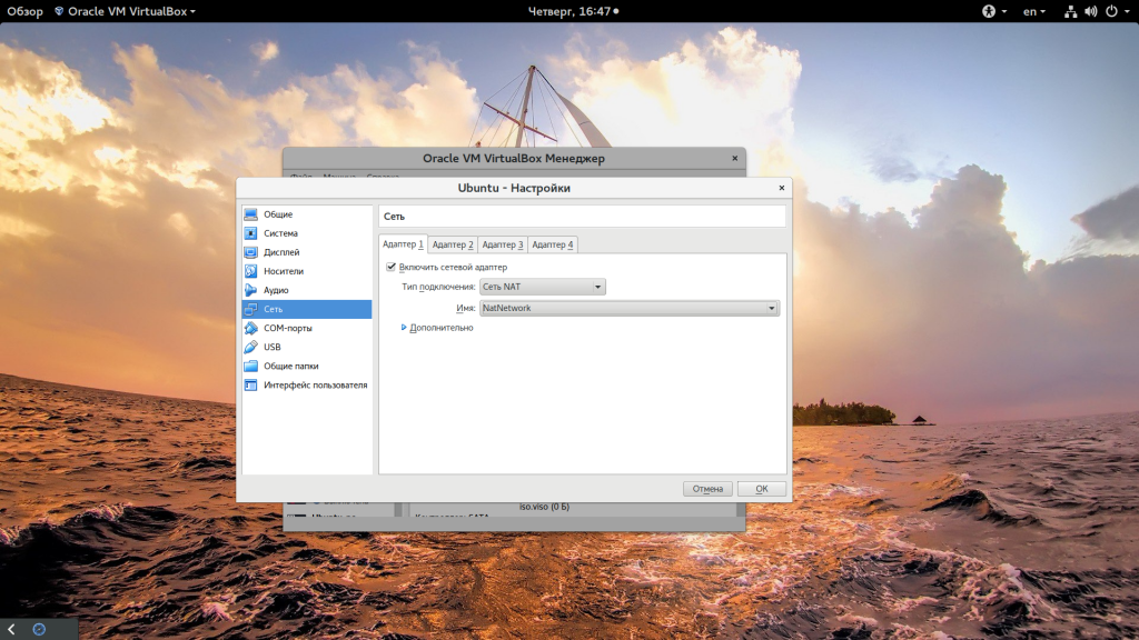 Нажмите «Ok» и закройте это окно. Дальше откройте настройки для виртуальной машины, перейдите на вкладку «Сеть» -> «Адаптер 1»: