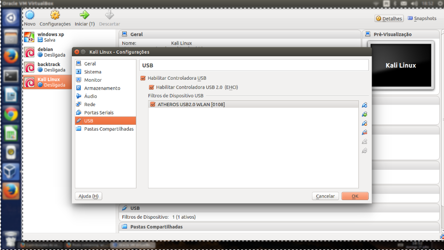 Поэтому всякий раз, когда была необходимость поэкспериментировать с беспроводными сетями с помощью aircrack’а и kismeta, чтобы послушать эфир или оценить защиту хотспота, приходилось запускать линукс с загрузочной флешки. Проблема эта, как оказалось, легко решаема благодаря возможности VirtualBox обращаться к USB-устройствам напрямую. Другими словами, можно купить за $20 USB’шный Wi-Fi-адаптер (причем сразу на правильном чипсете и с возможностью использовать внешнюю антенну) и сделать так, чтобы гостевая система думала, что он подключен к ней. Конечно, после подключения устройства к компьютеру/ноутбуку девайс определяется и устанавливается в основной системе (в моем случае — Windows). Но если зайти в свойства виртуальной машины и найти там раздел USB, то любое из устройств можно «примонтировать» к гостевой ОС. Для этого нажимаем на кнопку «Добавить новый фильтр» и из контекстного меню выбираем наш USB’шный адаптер. Все, устройство отключится от хостовой ОС и станет доступным в виртуальной машине. Пробуем запустить под Backtrack’ом aircrack и убеждаемся, что все работает. Наконец-то все это стало возможным без перезагрузки в Linux.
