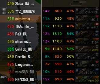 - Настраиваемые панели игроков: вы можете видеть статистику игроков вашей команды и команды противника, такую как процент побед, рейтинг WN8, количество боев и т.д. Также можно цветовое кодирование по своим предпочтениям. Это поможет оценить силы и слабости каждой команды и спланировать стратегию.