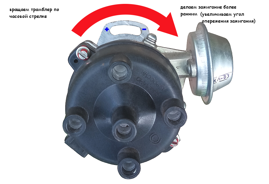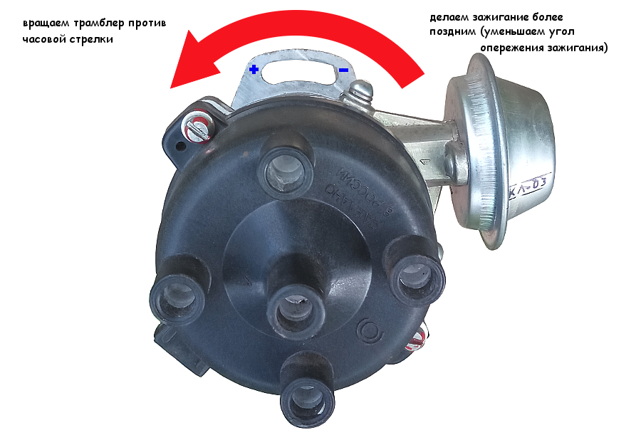 При таком действии угол будет увеличиваться. Если же проворачивать крышку против часовой стрелки, то угол зажигания, наоборот, будет снижаться.